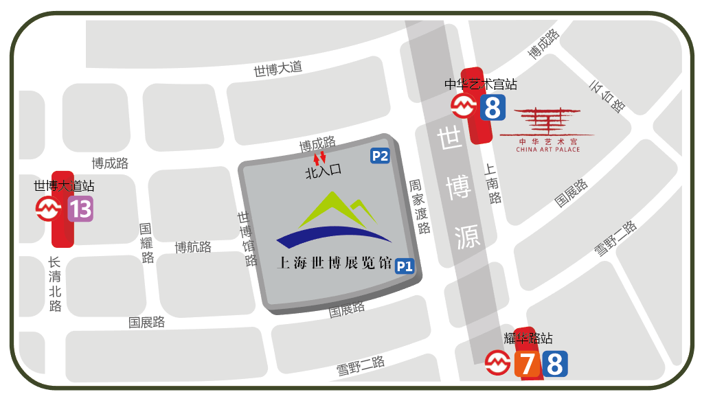 地铁8号线至中华艺术宫站3号出口,至上海世博展览馆北广场入场。