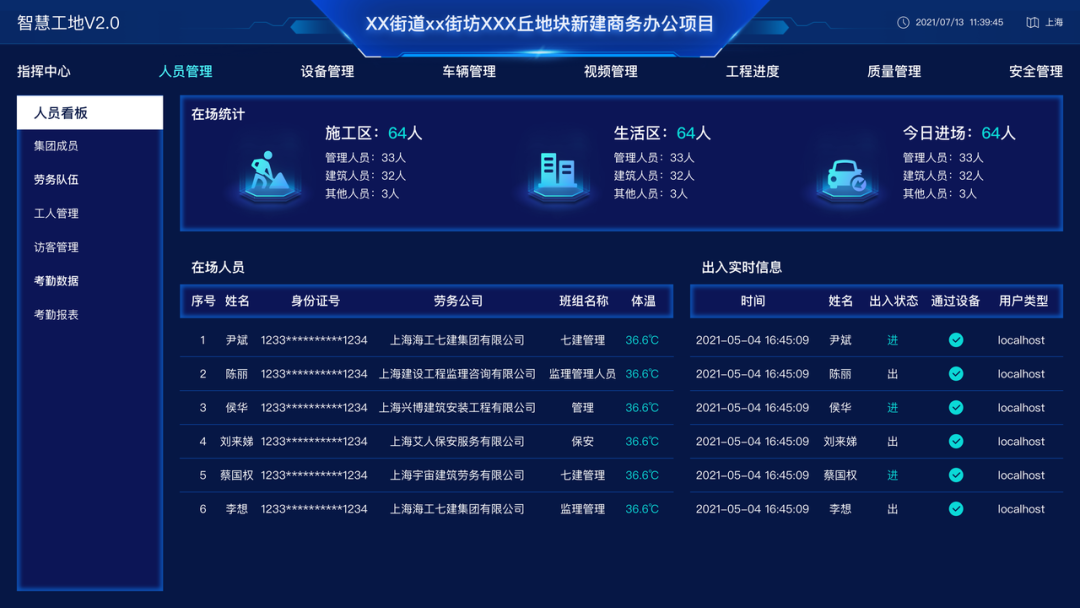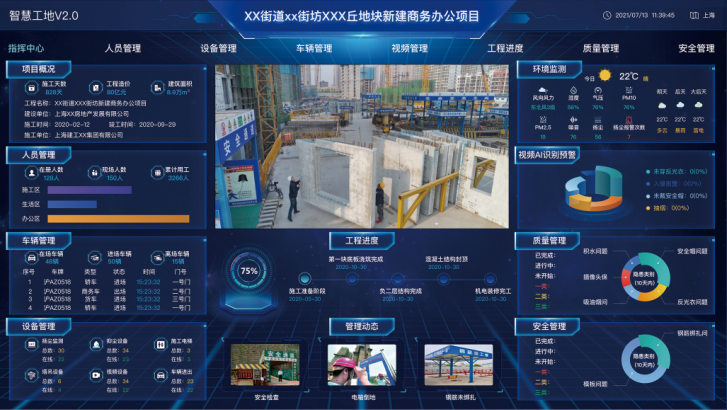 通过对接施工现场摄像头、闸机、车辆管理、环境、劳务管理、设备管理、质量安全管理等系统,将数据集中展示在大屏,随时了解现场的进度、人员、材料、设备、质量安全等问题,为项目管理提供有效支持。