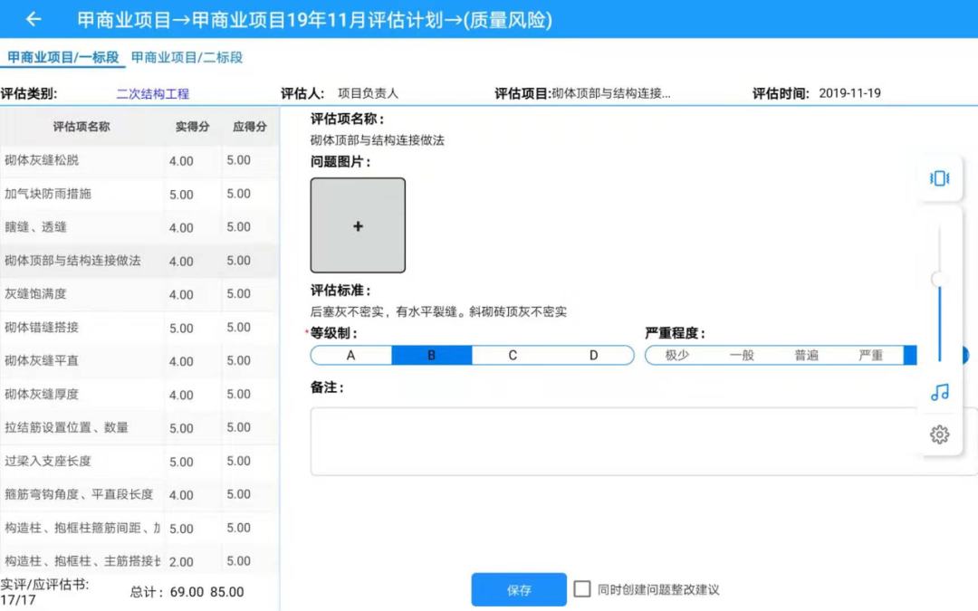 通过引入统一的公司评估标准,或者结合项目实际生成项目评估标准,基于现场实测实量数据,建立健全的、符合行业管理部门质量安全、文明施工要求的打分机制,可以生成项目质量安全报表、评估成绩单,实现对工程质量量化管理,有利于提升施工安全管理水平,提高工程品质与客户满意度。